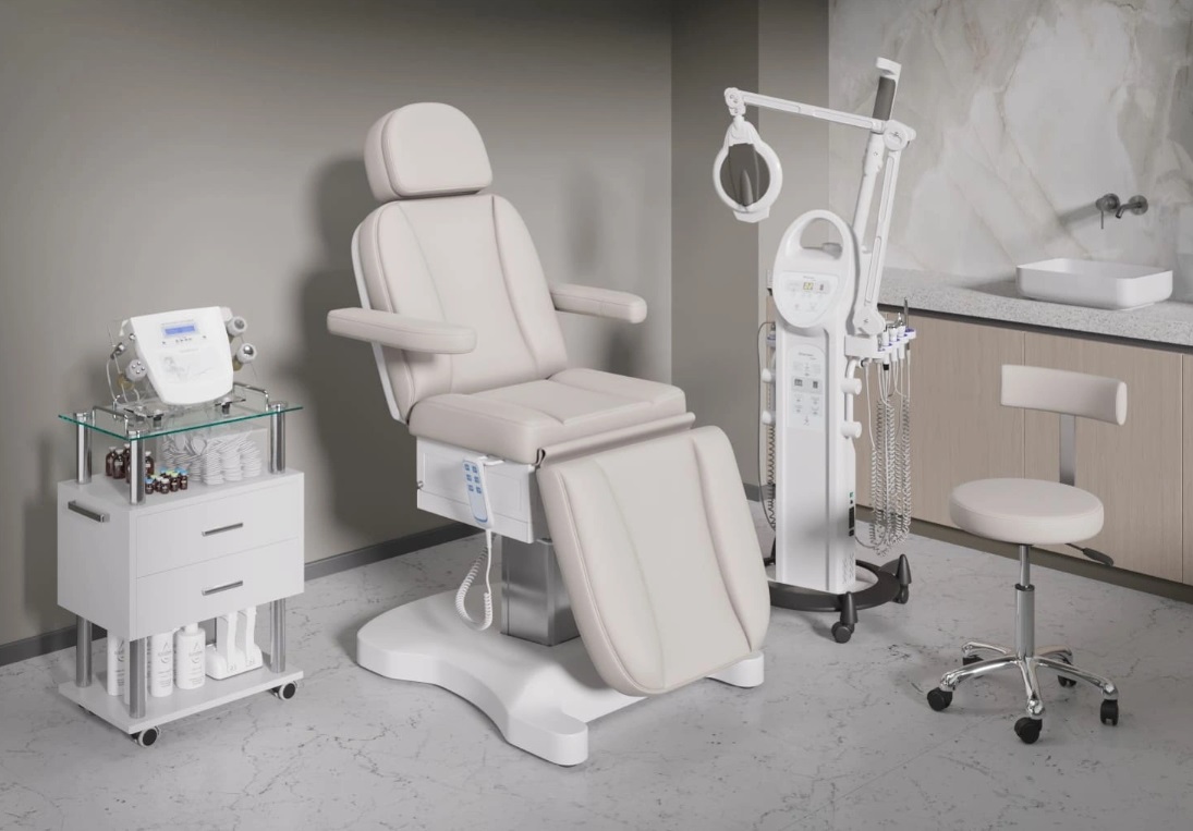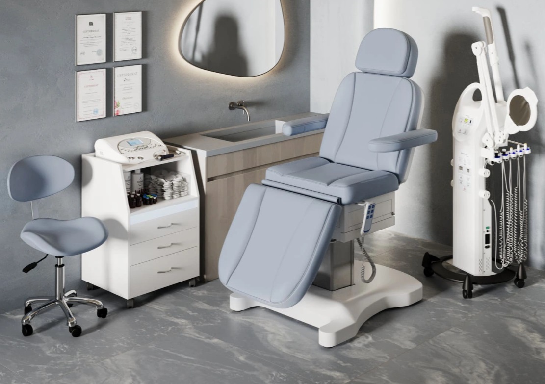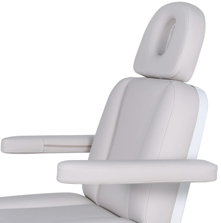 Три электромотора позволяют быстро и без усилий настроить высоту, угол наклона спинки и икроножной секции. Особое внимание уделено комфорту: инновационные подлокотники остаются горизонтальными в любом положении, мягкие элементы повторяют изгибы тела, а подголовник с анатомическим отверстием и подушкой делает процедуры максимально комфортными.