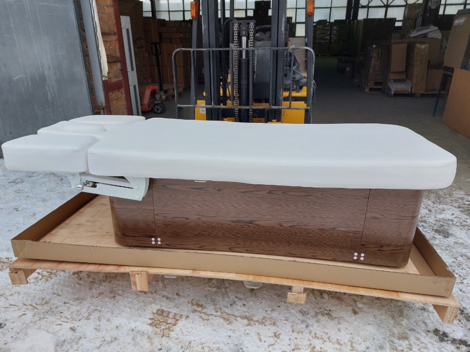 Внешний вид: Модель отличается массивным «закрытым» основанием с древесной текстурой, что придает ей вид стационарного спа-ложа, а не просто медицинской мебели.