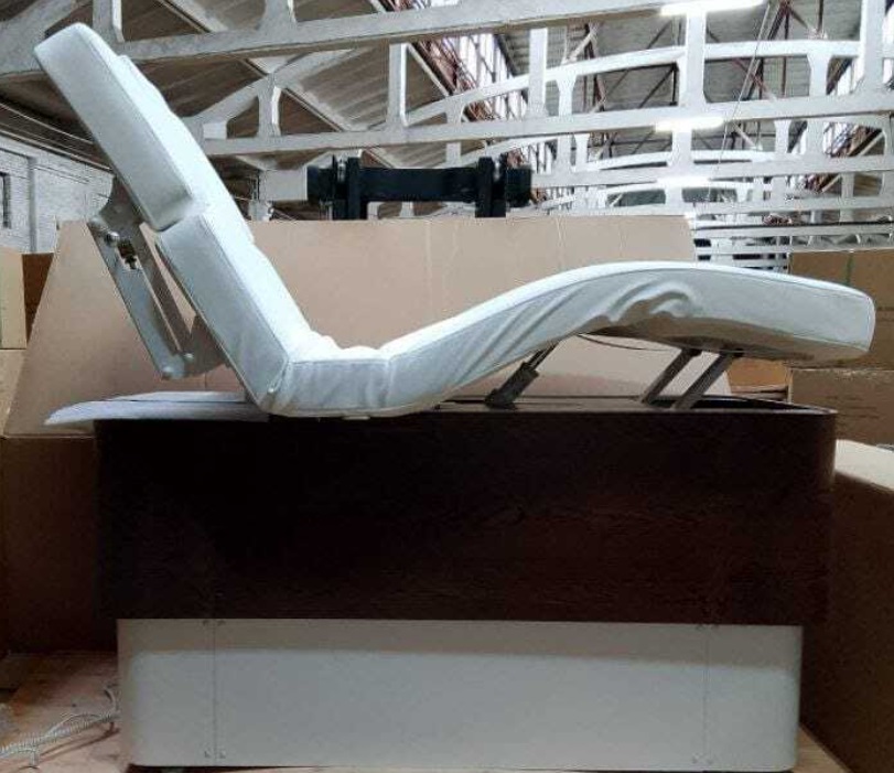 Регулировка секций и высоты осуществляется тремя электромоторами с пульта управления. Прочная конструкция, изысканный деревянный декор. В качестве наполнителя использован технологичный материал, который не потеряет свою форму и обеспечит комфорт каждому клиенту. Обивка кушетки — экокожа высокого класса, вы сможете с лёгкостью очистить поверхность.