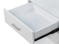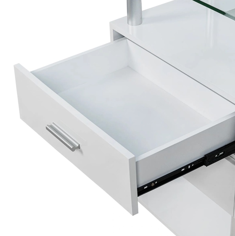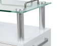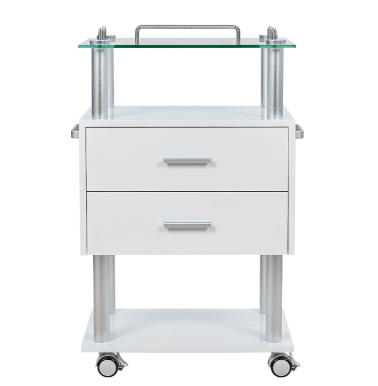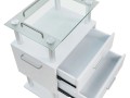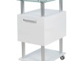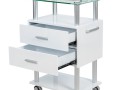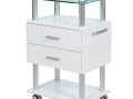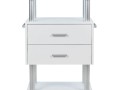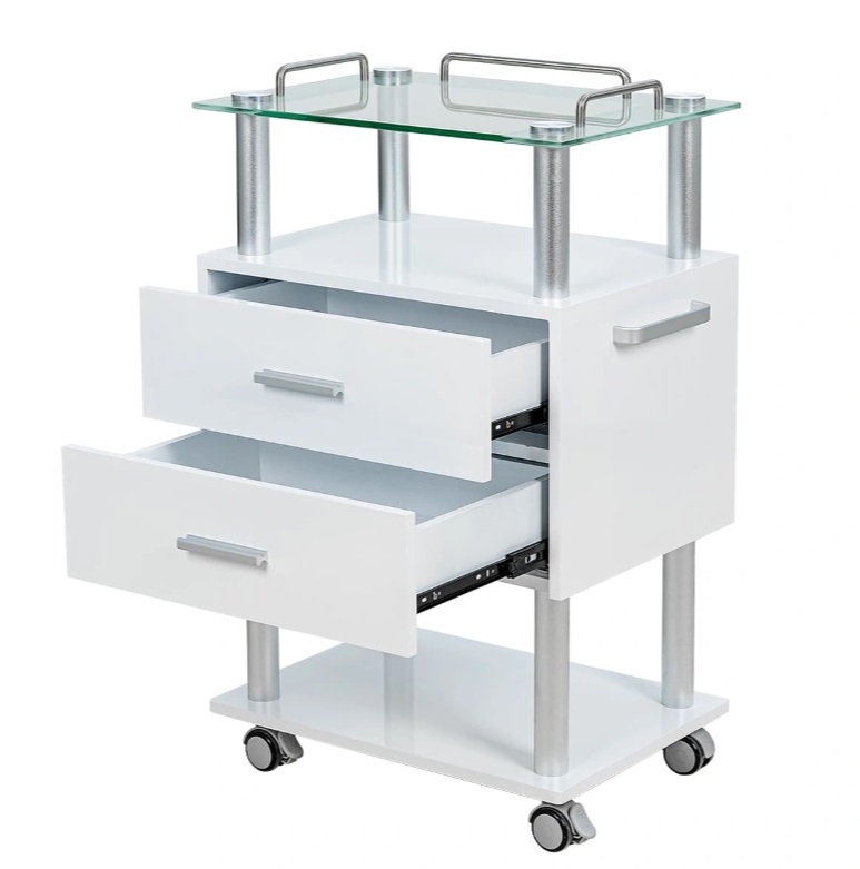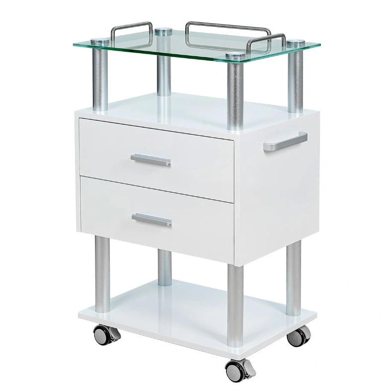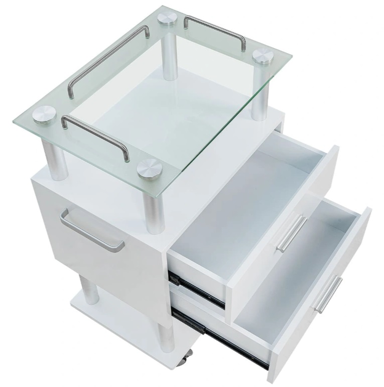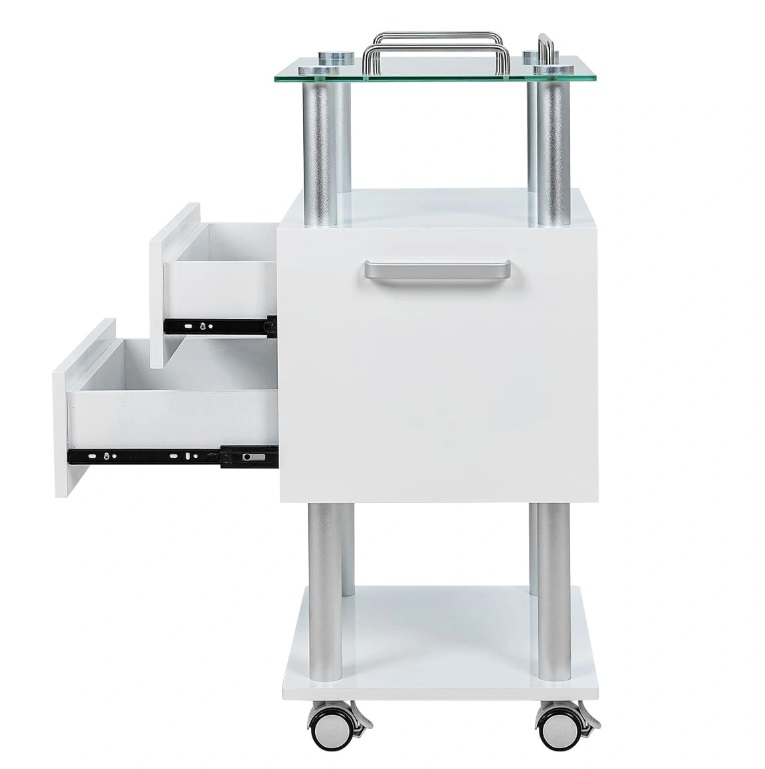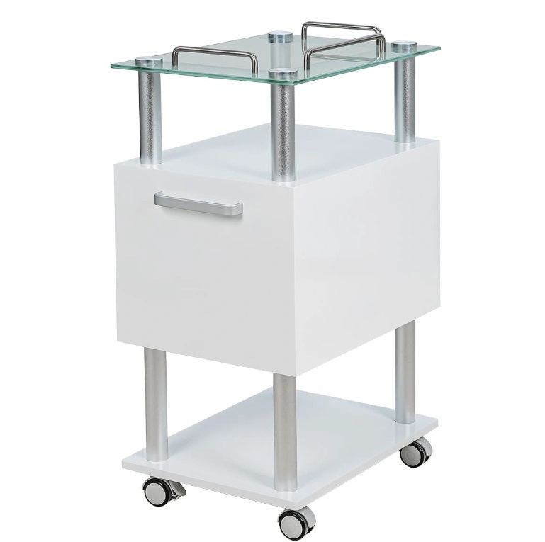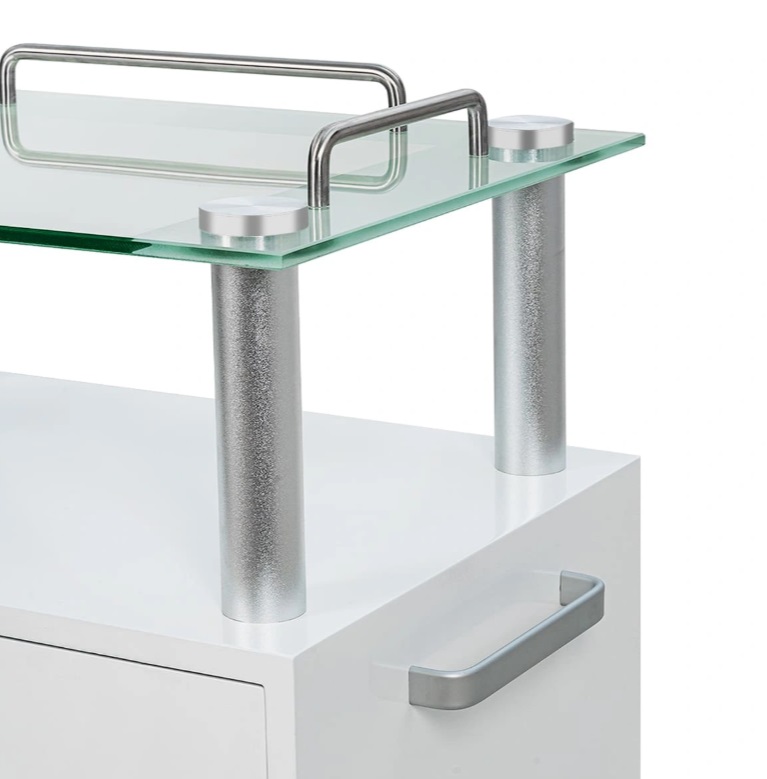 Тумбочка состоит из каркаса в виде хромированных труб, внизу и вверху расположены две открытые полки, на которых мастер может удобно разместить инструменты и принадлежности, исходя из своих предпочтений и проводимой процедуры. Для расходных материалов и аксессуаров между полками находятся два закрытых вместительных ящика. Сверху столика размещена стеклянная полка с хромированными бортиками, которые защищают хранящиеся на столике предметы от падения.