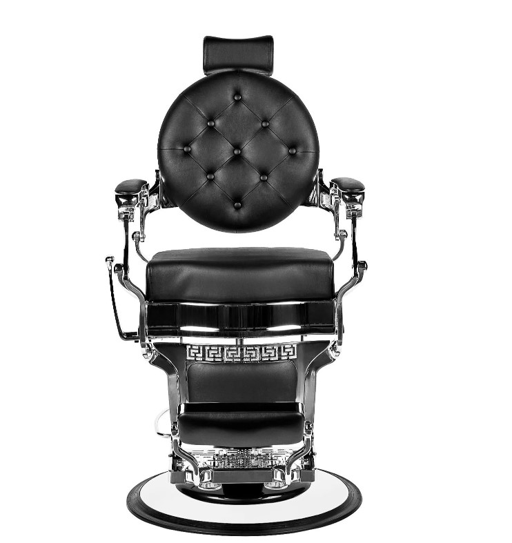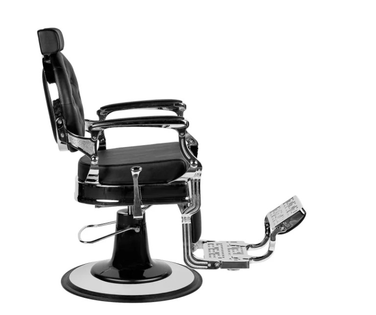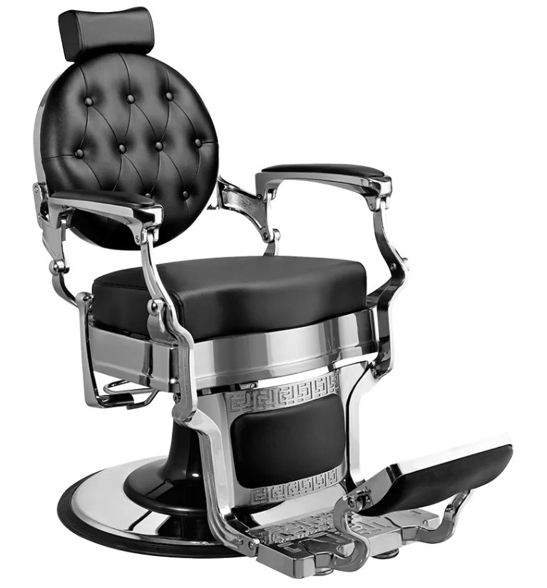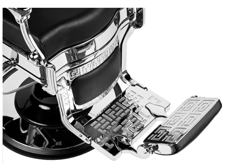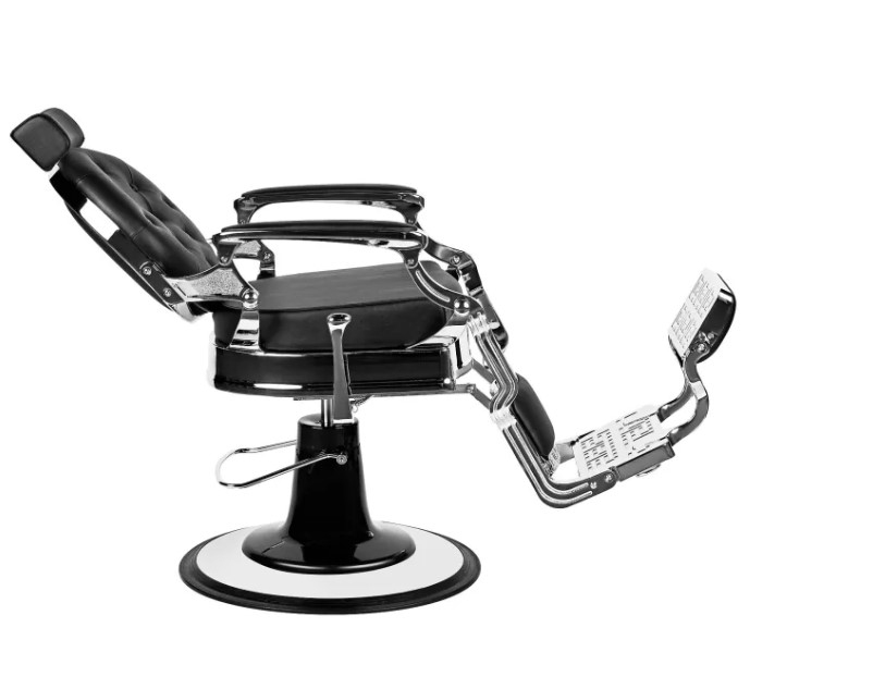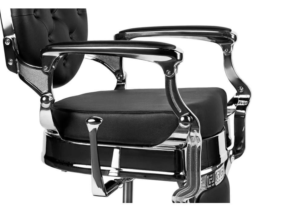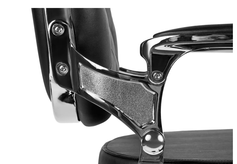 Изысканное парикмахерское кресло с цельнометаллическим каркасом из литого алюминия. Круглое основание и цельная конструкция с хромовой отделкой под серебро. Реверсивная подставка для ног. Качественный гидронасос. Сиденье с наполнителем высокой плотности для максимального комфорта и долговечности. Черная обивка из высококачественной эко-кожи.